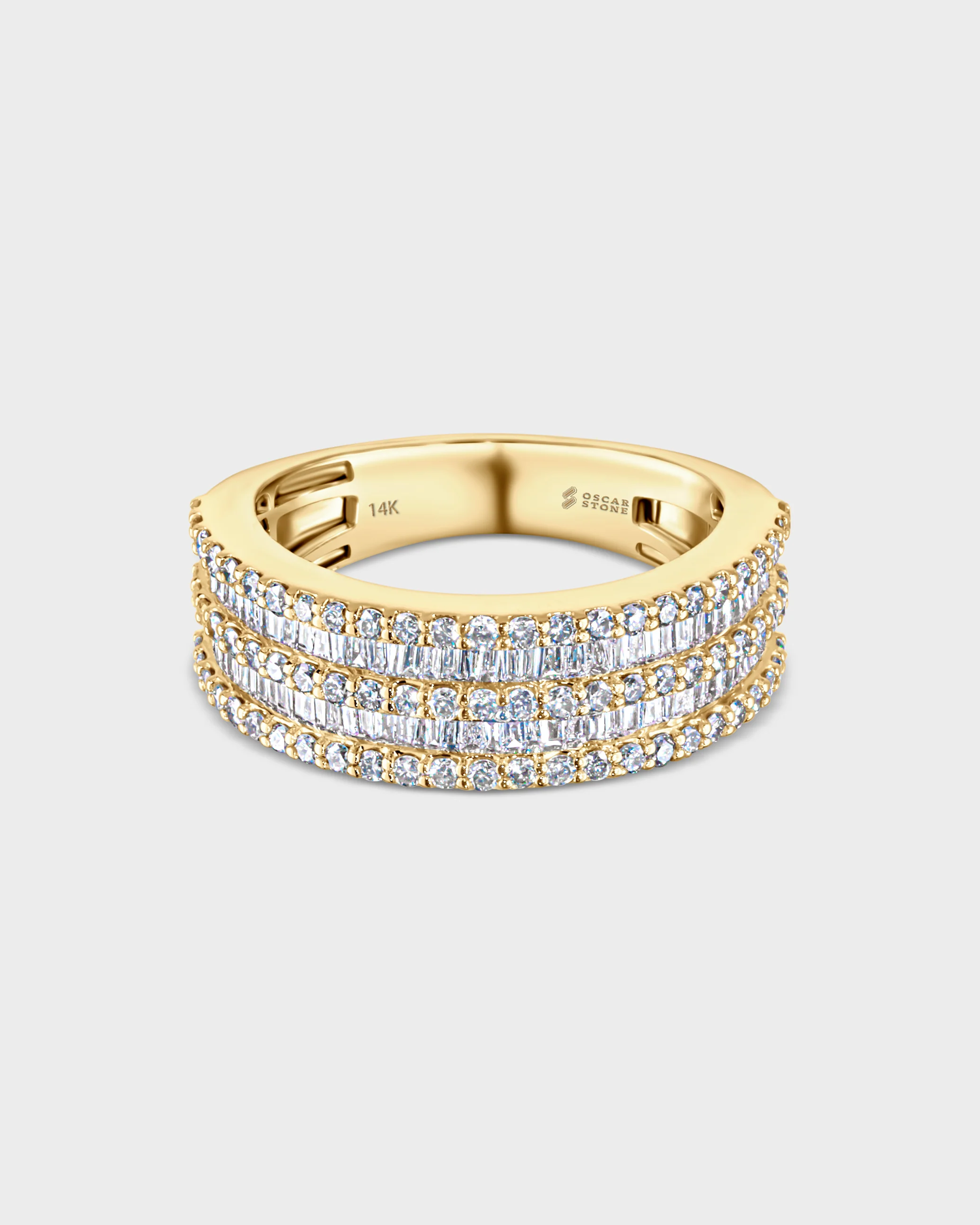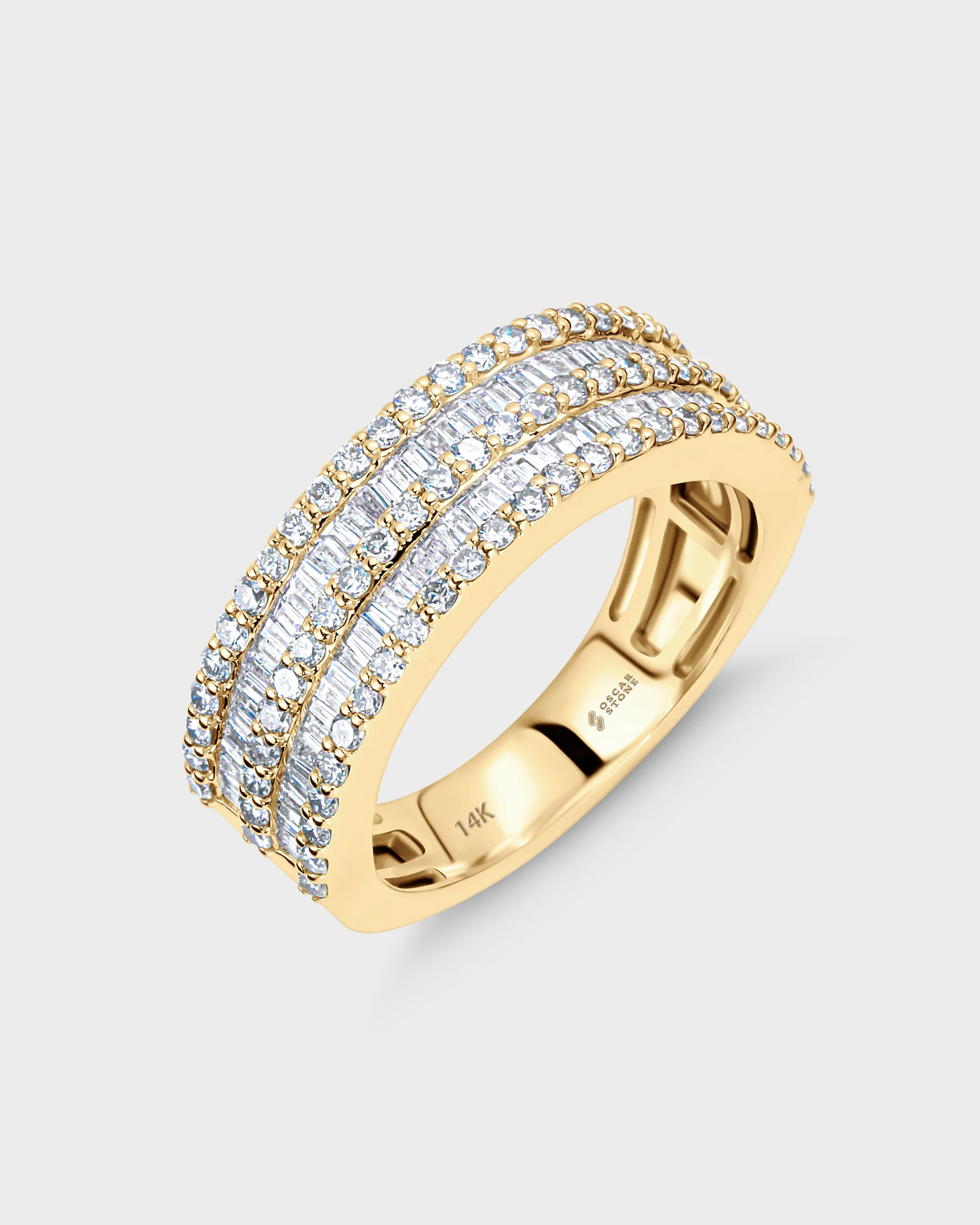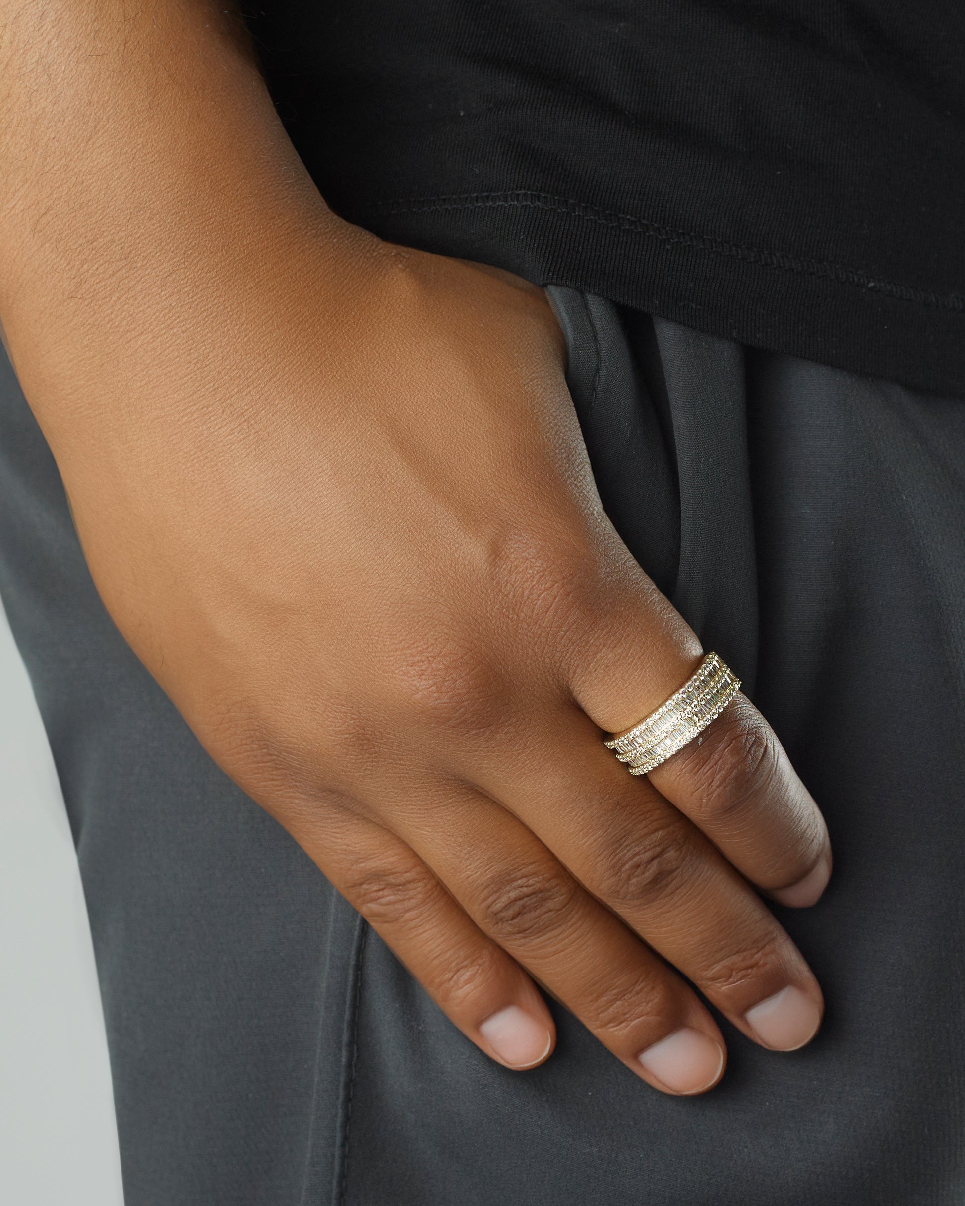 Realza tu estilo con este elegante anillo de oro amarillo de 10 quilates con banda de talla baguette. Con un peso de 9,1 gramos, esta impresionante pieza está adornada con 1,74 quilates de elegantes diamantes de talla baguette, lo que ofrece un diseño atemporal que irradia sofisticación y estilo.
