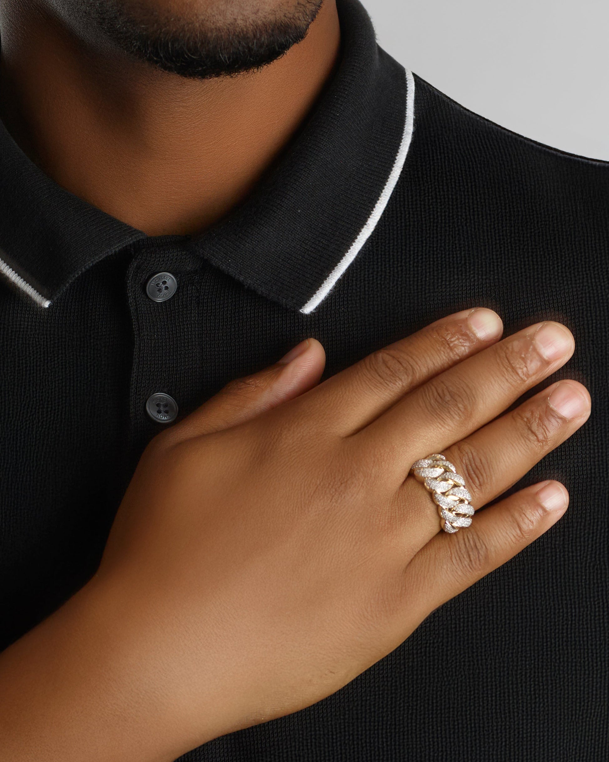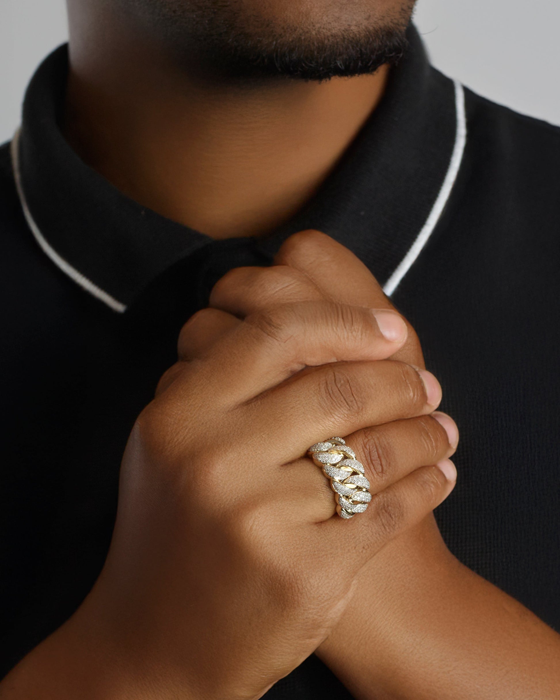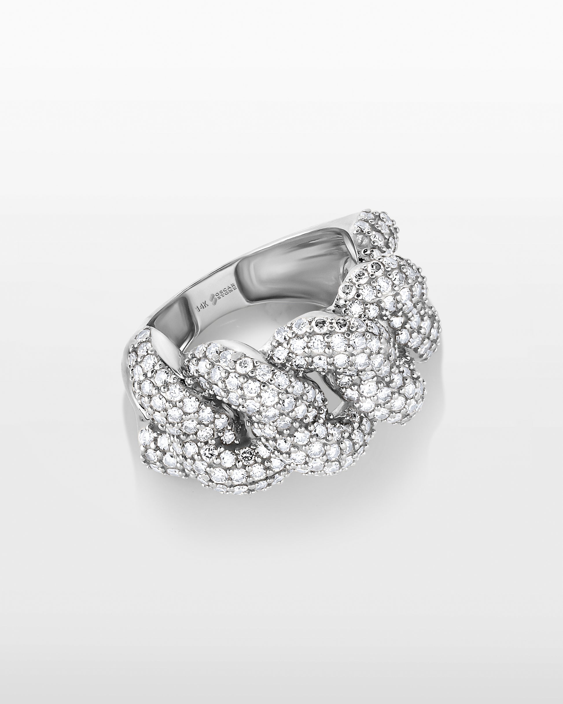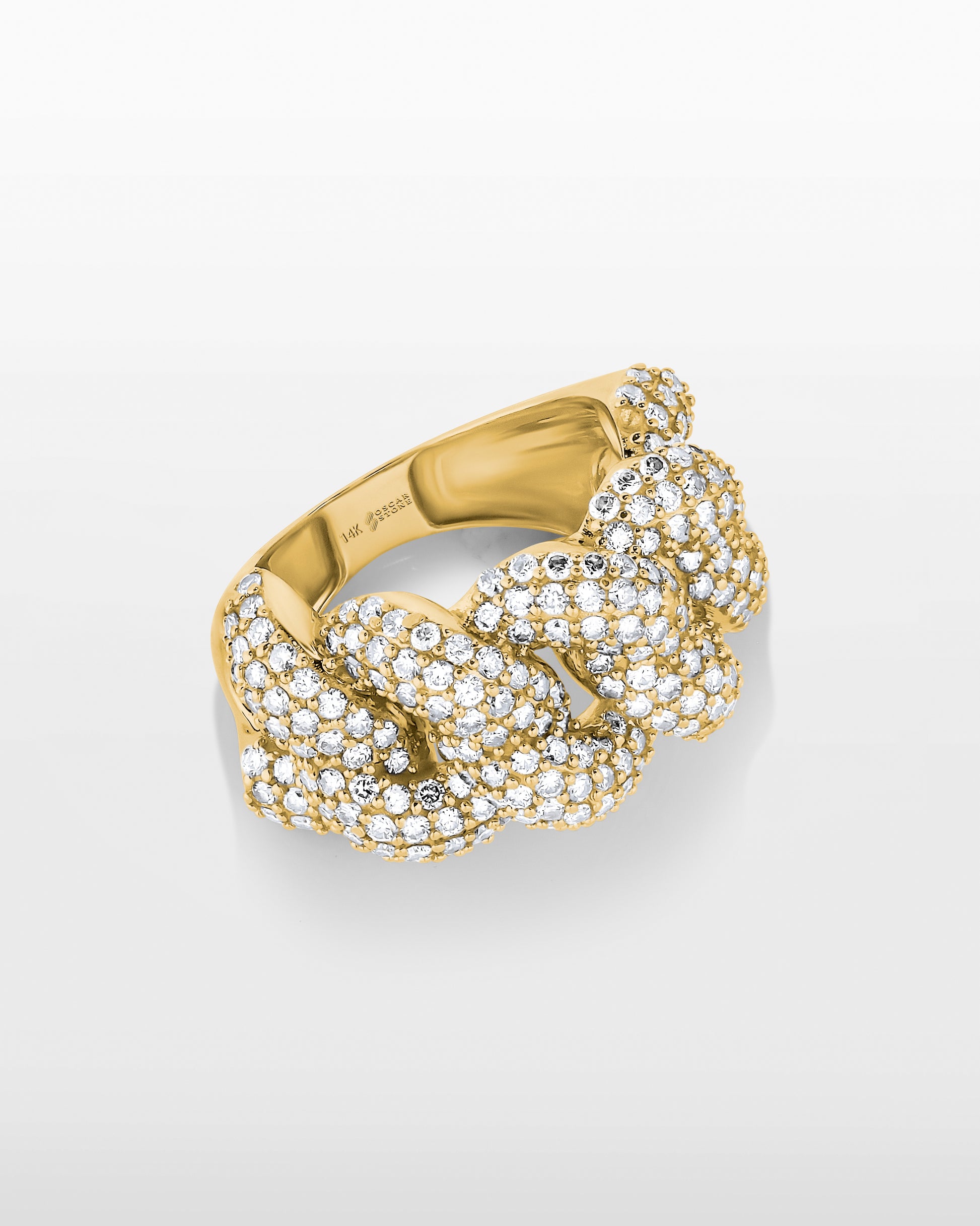 The Oscar Cubano Ring hits heavy with bold Cuban links fully iced in natural diamonds. It's not just a ring — it's a flex in gold.